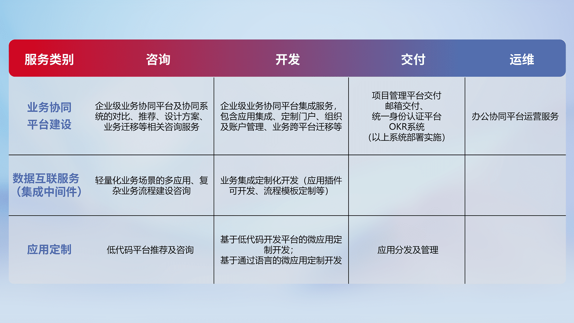 针对钉钉、、企微、、IDaas等平台级产品提供产品的规划、、方案、、、交付、、定制化开发等服务,,实现如统一协同办公、、智能客户服务、、、、混合会议管理、、、智能数据查询、、等业务场景,,实现数字化转型。。。